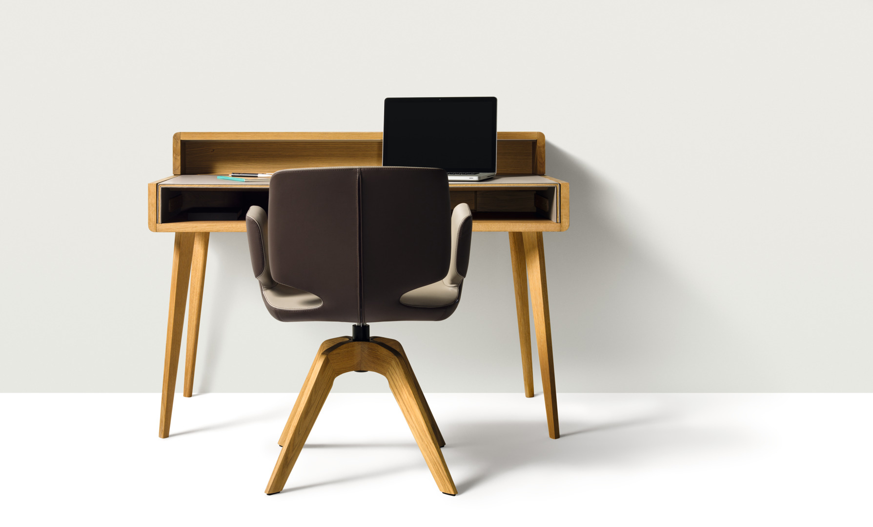 “Zwei ineinander laufende Schalen – die eine aus Holz, die andere mit Leder bezogen – bilden die smarte Grundidee von den Sol Schreibtischen. Handwerkliche Details, wie der aufwendige Lederbezug mit einer vorne sichtbaren Ader in der Produktholzart, und die Hirnholzkanten der Holzschale unterstreichen die qualitativ hochwertige Verarbeitung.”